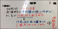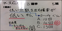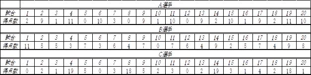 [状況①] C選手 15点差もあるので,A選手・B選手では最高12点しかとれないので,18点~20点とることが出来る可能性がある。 ![]() [状況②] A選手 8点差あるので,B選手だと8点以上が4回,C選手も4回しかない。A選手だと他の選手より10回で可能性が高い。 ![]() [状況③] B選手(A選手) 4点差あるので, C選手に比べると4点以下の数が少ないのでB選手かA選手。(4点以下の度数と4点以上の度数が同じだから) ![]() |