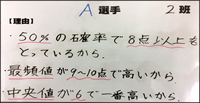 | ○選手を選ぶ理由を状況に応じて代表値やヒストグラムなどを活用しながら,他者にわかりやすく説明することができる。 |