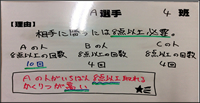 学習課題下の表は,バスケットボール選手であるA選手・B選手・C選手の最近20試合の第4ピリオドでの得点数をまとめたものである。あなたはチームの監督をしています。今,強豪チームであるKATO選抜チームと戦っている最中で,第3ピリオドが終わったところである。あなたは監督として,残りの第4ピリオドにあと1人どの選手を起用しますか。 |