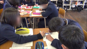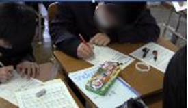 | 4 互いにアイディアを出し合いながら問題を考える。 | 15 | 小集団 | ・それぞれが考えた図をそれぞれに発表させる。 ・出させたアイディアの中からよりいいものをグループで選ばせる。・問題文で考えた図ができるかを確認させる。・相談しながら問題文を考えさせる。 | ・協力して課題に取り組めているか。(観察) ・図に結びつく問題文をつくることができるか。(観察) | ||