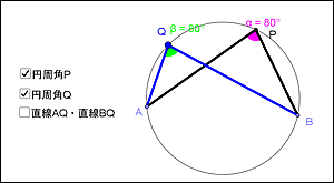 ・2つの円周角を直線ABに対して同じ側に表示したり,異なる側に動かしたりすることで,「円周角の定理」と「円に内接する四角形の性質」の関連を意識づける。