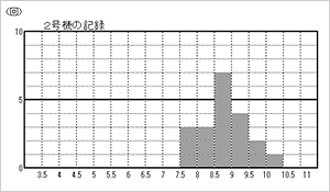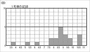 → 最大値が10.9mで2号機より長い。 10.5m以上の階級の度数が2号機より多い。 2号機を選ぶ → 最小値が7.6mで1号機より長い。 範囲が2.4mで1号機より小さい。 |