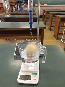 水につかっている体積を変化させると浮力が変化することや,アルキメデスの原理についてより理解が深まるのではと思いこの実験を行った。本校は45分授業であるが,すべての班がa. b.のところまでたどり着いた。実際に測定する前から「ばねはかりの値が減った分でだけ,キッチンスケールの値が増えるのでは」と予測していた生徒もいた。