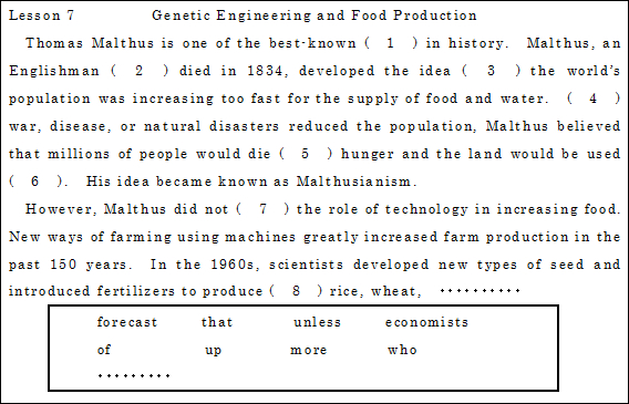 ①本校では,北海道大学を受験する生徒が多く,第4問の対照文に似せた問題を作成して取り組ませている。本来の問題は,対話文(Ⅰ)を読んで,その要約した文章(Ⅱ)に空所があり,その空所に入れるべき語を選択肢から選んで答える形式である。品詞を見分ける力があれば,対話文(Ⅰ)なしでも要約文(Ⅱ)を読んだだけで8割近くは答えられる。実際の問題は,12個の解答箇所に対して選択肢が24個あるのだが,授業では12個に対して12個としている。選択肢を増やすのが理想だが,進度を考えると5分間程度しかかけられない。
