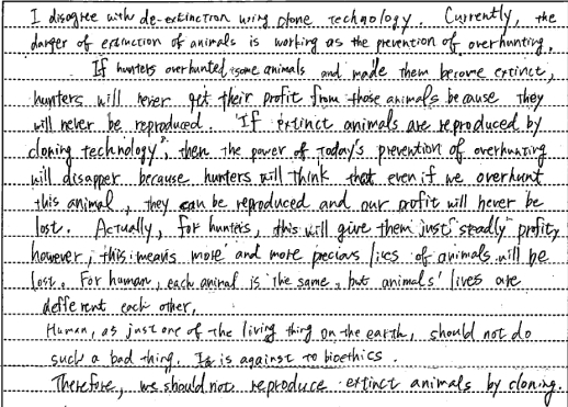 ディベートおよびビデオ視聴のあと,それぞれの生徒が,今回のトピックに関する自分の考えをエッセイにまとめた。全体的な印象としては,内容が良く深まっており,授業時間内にあまり書くための時間を設けなくても,まとまった英文を流暢に書くことができていた。生徒の書いたエッセイの一例を紹介する。