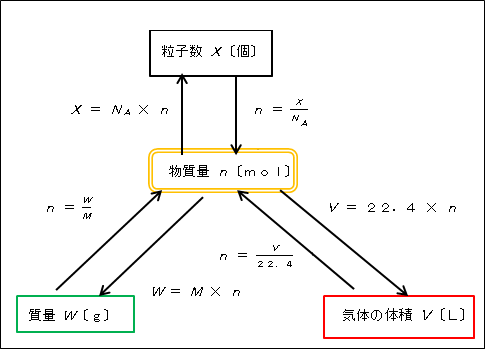 〔図4〕「物質量n 」・「 粒子数X 」・「 質量W 」の関係