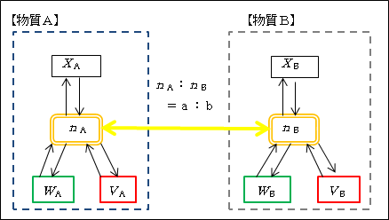 この際に,【物質A】【物質B】の2物質について,〔図5〕を用いて各物質の係数をa,bとし,以下の〔図6〕を示すことで「イメージ化」ができる。ここでは,それぞれの「換算式」等を省略したものを示す。