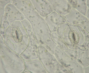 続いて,生徒たちはエンドウの果実を開いてみる。図2の下のような開き方をすると,種子が縁に並び,先ほど枯れ葉かと思ったものが果皮であることが理解できる。さらに,エンドウの果実の表皮を顕微鏡で見ると図3のような気孔が観察でき,文豪ゲーテが1790年に著書『植物変態論』で唱えた,葉が変化して花ができたという,植物の進化を実感できる。ただし,気孔については,50分の授業では生徒に作業させる時間はとれないので,教師用顕微鏡での提示にしている。50分2コマ連続の授業なら生徒に観察させることも可能かもしれないが,タマネギの表皮のように簡単には剥がれないので,かなりの時間をとられるであろう。