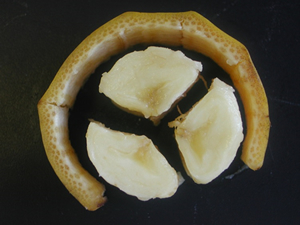 果実の中に,種子の入る部屋がいくつあるのかが,雌しべを形成する心皮の数に対応している。授業では,『花の観察学入門』を参考に,バナナとオクラの果実の断面も観察させている。バナナは輪切りにしたものを生徒に配る。皮の周りから指で軽く押してやると,3つのブロックに分かれ,3枚の心皮からなる雌しべであったことが分かる(図4)。オクラは果実の断面を見ると5枚の心皮からなる雌しべであることがわかるが,たまに,種子の入る部屋を6部屋もつものも見られる。はじめに紹介したアオギリは5枚の心皮からなる雌しべで,果実の成熟過程で子房ごとに分かれる分離果である(図5)。アオギリは樹高がかなり高くならないと花を咲かせないので,手の届く高さに果実はできない。落ちている果実から,図5のように5枚の果皮がバラバラにならずに残っているものを探すのは大変なのだが,なんとか1つは手に入れて生徒に提示したい。