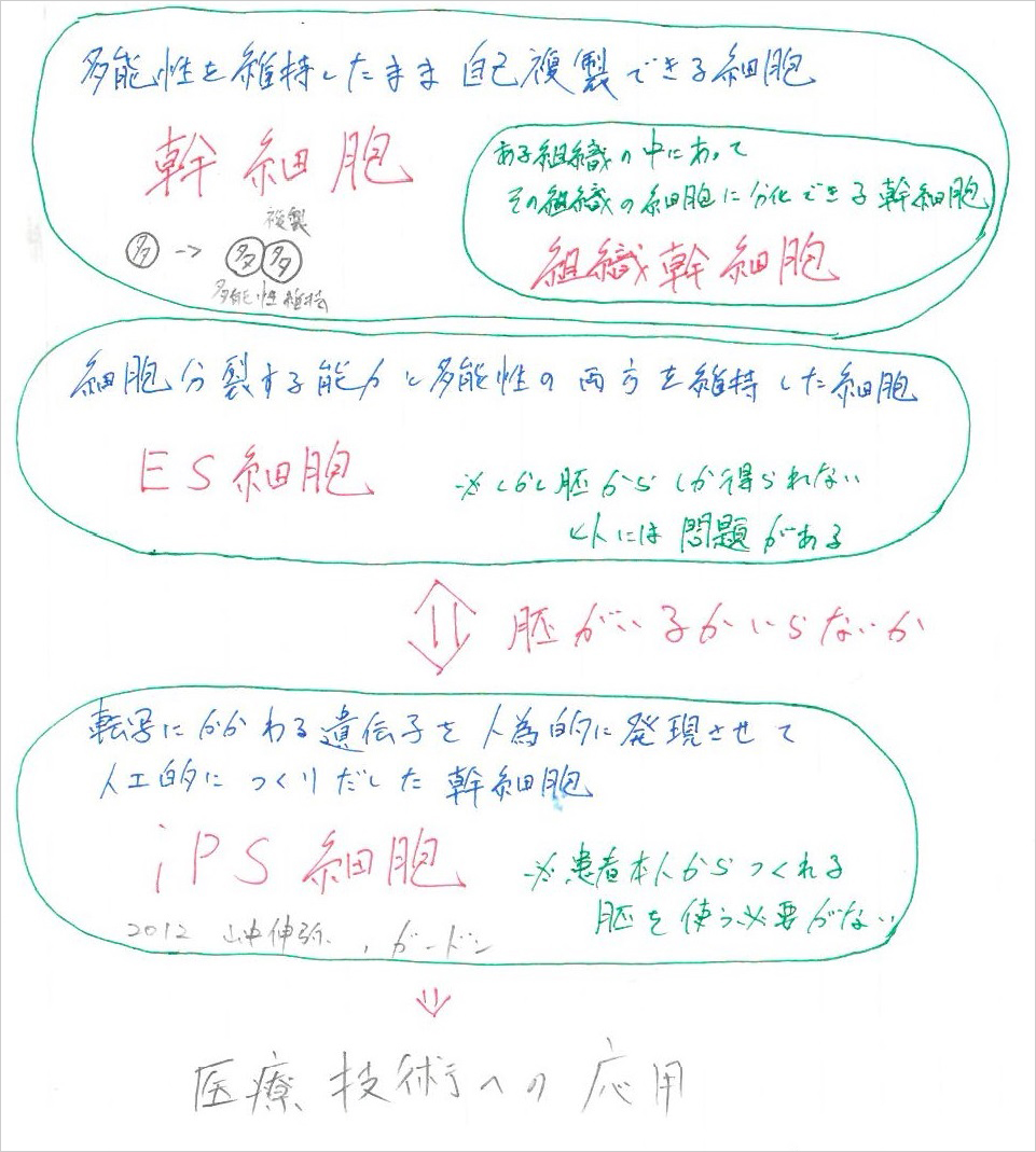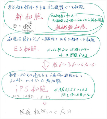 ステップ2は,調べるためにインターネット等が必要となる場合もあり,終わらない分は宿題とし,次に,文章全体を精読するように伝えた。そして,この文章を通して,高校生に何を伝えたいのか,その主張を自分の言葉で簡潔にまとめるように指示した。ここでは,「多能性を持つ細胞を人工的に作り出す技術が医療分野で期待されている」等,本文の最初の部分から主張を読み取り引用しているものが目立った。