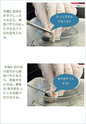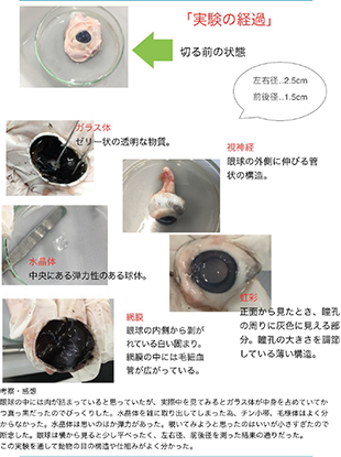 通常のカリキュラムでも,中学2年次に感覚器官について学習することになっており,検定教科書にも「ヒトの目のつくり」として眼球の構造が簡単に掲載されているが,本校では,高校の生物(4単位)に近い内容で授業を行っている。ヒトの眼球の構造や,明暗調節,遠近調節等を3コマ程度を使って学習した後,実習として「ブタの眼球の解剖」を行った。概要は以下である。
