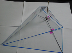 展開図を配布し,生徒自らが立体を組み立てて問題に取り組ませた。問題1とは異なり,垂線の足の位置が展開図における底面の三角形の外部に存在することから,見取り図では考えにくいことを実感していた。そこで,展開図における垂線の位置の作図方法を用いて,問題解決に取り組む姿勢が見受けられた。