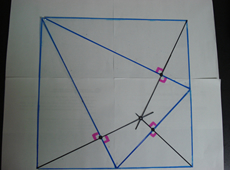 3つの面がそれぞれ互いに垂直であることになかなか気付かない生徒もいたが,実際に展開図を配布し,自ら立体を組み立てることで,その事実を確認し,根拠を考えることができた。続いて,次の問題を考えさせた。垂線の足の位置に関する発問である。
