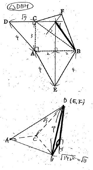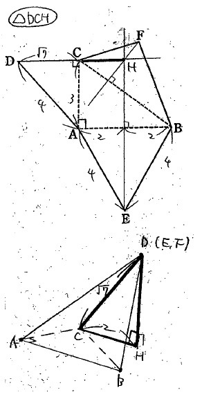 体積は辺や垂線の長さから求めるのが自然な発想であり,四面体の体積から垂線の長さを求める思考の流れに,技巧的な印象を強く受けた。そもそも,垂線の長さに注目するのみで,垂線そのものについて深く考察できていない点に,思考の中途半端さを感じる。垂線の足の位置はどこに存在するのか考えることなく,単に垂線の長さのみ求めるのであれば,図形的な考察は不十分であると感じた。