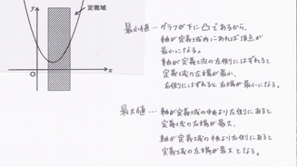 座標平面上にある定義域が描かれている。2次関数のグラフプレートを動かしながら,軸と定義域の位置関係が変化するにつれて,関数の最小値および最大値がどうなるか考察せよ。