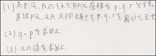 確かに,模範解答から分かるように,q-pの値が求まれば,aの値が求まるわけだが,この(2)の答えをどのような小問をつくって誘導するかがポイントであり,適切な小問とは言い難い。