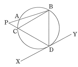 [1] 図の直線XYは,点Dで円と接している。PA=1, AB=2, BC=BD=4, ∠BDY=60°のとき,PCの長さを求めよ。