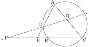 [2] 図のように,2点A,Cが円周上の点となっている△ABCがあり,円と辺AB,辺BCとの交点をD,Eとする。半直線CB上に,BP=8となる点Pをとり, 直線PDと辺ACとの交点をQとする。AD=5,BD=3,BE=2,∠ABC=72°のとき,次の問に答えよ。