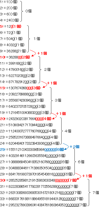 - ③5の倍数,たとえば5,10,15,20のときはその直前よりも末尾に並ぶ0の個数が1個だけ多くなるが,25のときはその直前よりも2個だけ多くなる。