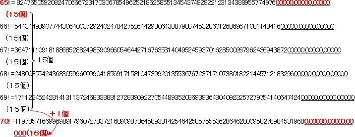 しかし,「階乗の表」を利用して,n!の末尾に並ぶ0の個数を調べれば,
