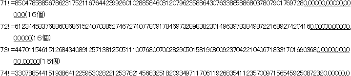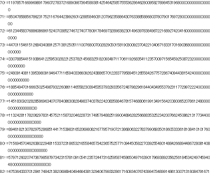 教科書の巻末には学習内容に応じたいろいろな表が載せてある。少々掲載スペースが広くなるので難しいと思うのではあるが,その中に「階乗の表」も付け加えて欲しいものである。