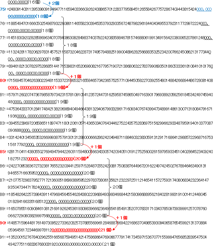- ④全体を眺めれば,25,50,75,100という5の倍数のとき(青)の階乗における末尾に並ぶ0の個数はその直前よりも2個だけ多くなるが,それ以外の5の倍数(赤)の階乗における末尾に並ぶ0の個数はその直前よりも1個だけ多くなる。