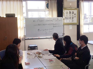 もう一つ事例を紹介する。教科会議の時間を利用して研究授業を年に数回実施している。下の写真はある日の研究授業の振り返り会の様子である。この日の研究授業の内容は条件付確率の導入における活用で,主に与えられた資料から問題を作り相互に解くというものであった。