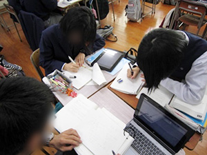 本校の高校1年生のクラスでは,電子化された問題集(自主学習支援アプリ「ATLS(アトラス)」の試行版)を利用しています。ICTを利用することで脳をフル回転させ,興味・関心が高い状態を持続させることを心掛けています。