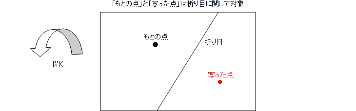 つまり,ある直線を折り目として折ったとき,重なる2点がその直線に関して(線)対称ということなのである。一方,ある点を中心にして180°だけ回転したとき,重なる2点がその点に関して(点)対称ということなのである。