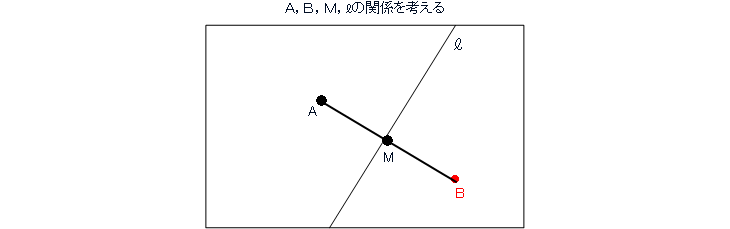 次に,図5のように2点A,Bを結び,線分ABと直線ℓの交点をMとする。(これも書き込ませる。)ここで,どのようなことが成り立っているか気付くことを言わせてみる。見た感じでよい。