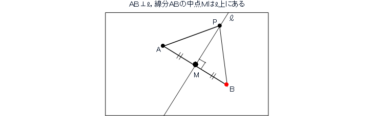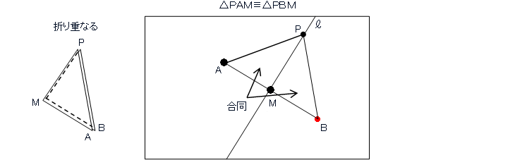 ℓ上にMとは異なる点Pをとって,△PAMと△PBMに着目させる。これは②の理由になるが,折り返して重なっていたことから,AM=BMである。また,PM=PM(共通),PA=PBでもあるから,△PAM≡△PBMよって,∠PMA=∠PMBである。∠PMA+∠PMB=180°であるから,∠PMA=∠PMB=90°よって,AB⊥ℓである。③については,線分ABと直線ℓの交点をMとしたのであるから当然である。これから,図7のようになる。