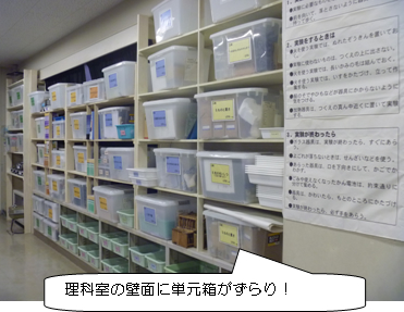 しかし,これらは未だ完成ではありません。冒頭で触れたように先輩の経験と知恵の継承が困難になってきている現状の改善に役立つものとしても,この単元箱の存在意義があります。今後,実際に授業で使用した教員オリジナルのプリントや道具などを追加すれば,様々な視点からの授業が見えてきます。そして,それが少しずつ積み重なって,学校の教員全員の知恵が詰まった箱になれば素晴らしいと思います。実験器具の充実にむけた予算の獲得や不足分・破損分の補充などを含めた適切な管理(現在の所,理科支援員が大きな力となっている)など,まだまだ改善しなければいけない課題はありますが,理科好きの先生,理科好きの子どもを増やしていくために理科室をどんどん使いやすいものにしていきたいと考えています。