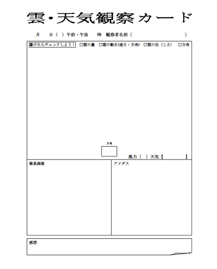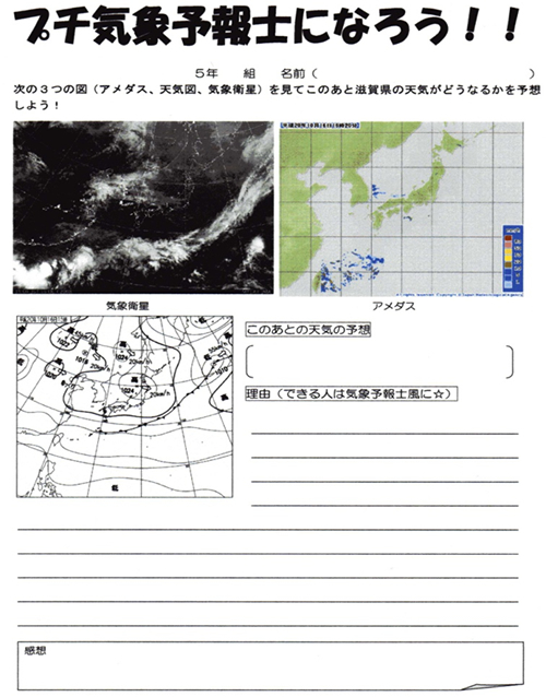 子どもたちに,3日間(晴天,曇り,雨天)空を定点観察させた。その際ワークシートには同日同時間帯の気象衛星やアメダスの情報を貼り付けるスペースを作り,観察後ワークシートに貼れるようにした。簡単にアメダスと気象衛星の読み方を説明するだけでも理解ができたようで,滋賀県の位置を探して,実際の空の様子と照らし合わせて見ていた。