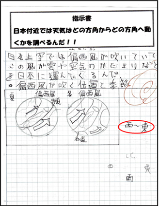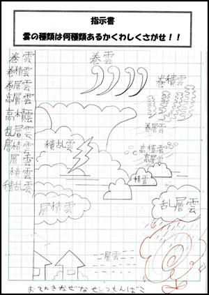 天気についての基礎知識は調べ学習を主体として知識を獲得させた。実際に空を見たり,観察したりしたことを通して,子どもたちから疑問として出てきた課題や,身につけておいてほしい課題を「指示書」と称して子ども達に配り,その指示書をもとに図書室やパソコン室(インターネット)で調べさせた。