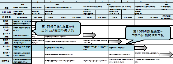 単元指導計画の作成においては,「身につけさせたい知識や技能」という教師側の意図と,「追究したい疑問や気づき」という児童側の意図の両立に悩むことが少なくない。そこで,予想される児童の疑問や気づきを表に整理し,それをもとに単元指導計画を作成するようにした。これによって,それぞれの課題に児童の疑問や気づきが生まれる充分な「しかけ」がなされているのか,各課題につながりや発展性が見込まれるかといった確認を行い,指導内容や教材教具の工夫に取り組んだ。さらに,授業後は実際に児童から出された疑問や気づきを反映させ,次年度の参考となるようにした。下の表はそのレイアウトである。