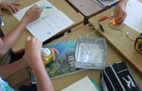 実験を通し,児童は「同じ蓄電量での点灯時間の差」「消費する電気の量」「豆電球の発熱」を関連付け,「発光ダイオードは発熱に電気を消費しない分,省エネである」という結論にいたった。また,最後に家庭で使用される一般的な白熱電球のフィラメントが3000度前後にもなることを紹介した。これらにより児童の多くは発光ダイオードの省エネ性を理解するとともに,フィラメントで起こる「発熱」について高い関心を示していた。