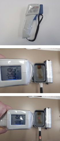 多くの児童が,ろうを使った実験を計画していた中,ある児童が,熱したフライパンの温度を測ってみたいと考えたので,右のような放射温度計を使って測定させた。