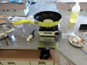 クレープは実験用ガスコンロでフライパンの中央を熱して焼いた。「どこから焼けるか見ときよ。」「よくわかる写真を撮ろう。」という教師の指示に対し,「1枚目は真ん中から固まったのに,2枚目ははしから固まったよ。」「2枚目は,フライパンがあたたまっていたからはしから固まったんだ!」という子どもの発言があった。大型テレビでデジカメの写真を見せることで,クレープの固まり方の違いから,子どもたちに,金属の板は熱が広がるのではないか,どのように熱は広がるのだろうという興味や疑問が湧いてきた。