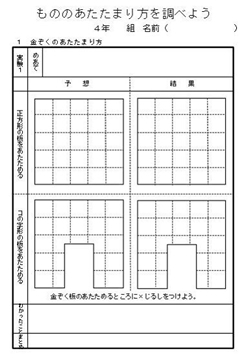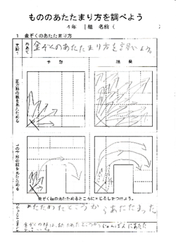 予想と結果を並べて表現し,ちがいを比べることができるようにした。伝わり具合がよくわかるようにマトリクスを入れた。実験では,班で相談してどこをあたためるか決めさせた。あたためる所に×印をつけさせ,そこから矢印で熱の伝わり方を予想させた。