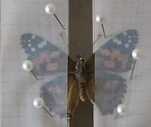 チョウの標本をつくるには,展翅板(てんしばん)という道具を使います。展翅板を使ってチョウの標本をつくることを「展翅する,またはただ単に展翅」といいます。チョウの胸に昆虫針(ステンレス製)を垂直に刺し,昆虫針を摘んだまま展翅板中央の溝に垂直に刺します。そのあと,展翅板の両側に乗せておいた展翅テープと板の間にチョウの翅を左右それぞれ挟み,昆虫針を翅の筋の下に引っ掛けながらバランスよく翅を上げ,玉針で留めていきます。玉針を10本程度使いながら,前の翅や後ろの翅全体をバランスよく見てそろえていきます。その際,頭胸腹も展翅板に沿うように直します。最後に触覚を展翅テープに挟んで,チョウの展翅はできあがりです。針を扱うので,児童に対して指に刺さないよう注意を促します。