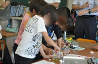 子どもたちや各班から出された観察や実験の結果を基に,「これらからわかったことは何か」を話し合う場を設定することで,子どもたちの思考力を育む。それをもとに結果からわかったことを導き出し,思考を伴った学習を進める。予想をワークに書かせ,班の中で意見をまとめたり,自分なりの意見を話し合ったりする時間をとり,観察・実験の終わった後,結果についても班で話し合いクラス全体へ自分たちなりの表現で発表する流れをとった。また,観察した水中の小さな生き物をイラストに書いたり,デジタルカメラで撮影したりして,発表の際に友だちに見せ説明しやすくする工夫も行った。