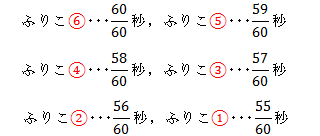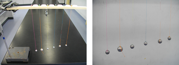 この教具は,6つのふりこが付いている。おもりの重さは空気抵抗に左右されない,ある程度の重さをもった適当なものである。ふりこの長さは,右図のように図に表すと,①のふりこが一番短く,左に行くに従って次第に長くなっている。1往復する時間が以下のようになるようにふりこを作成する。