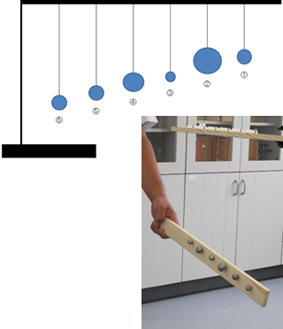 この教具を使い,「この6個のふりこを同時に振らすと,どんな動きをしますか」という課題を与え,考えさせる。