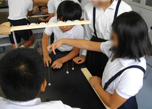 この3つの既習の科学的知識から「この6つのふりこは規則正しく前から順に振れ,ヘビのように見える」と予想させる。「観察・実験」の場面では6個のふりこが同時に振れる実験をして,観察・記録させる。このふりこは規則正しく前から順に振れ,まるでヘビのように振れたというだけでなく,観察を続けるとふりこが3つのグループになったり,2つのグループになったりしながら振れることに気がつく。既習の科学的知識を活用して,ヘビのように振れることは説明できるが,3つのグループになったり,2つのグループになったりして振れることの理由は既習の科学的知識を活用しても説明することは難しい。この現象は,より条件を制御した2つのふりこを用い,算数で習得した最小公倍数を活用させながら,説明することができる。しかし,この扱いについては,児童の実態に応じて指導していく。