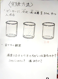 このような実験を通して「このモヤモヤはなんだろう。」「塩が消えると出てくるので,塩かも。」「他でもモヤモヤがでるのだろうか。」「やっぱり水が増える。」「どれだけとけるのかな。」といった気づきや疑問がでてきた。この後子どもたちが家から持ってきた,かたくり粉やコーヒーの粉などを使って実験し,溶けること溶けないことを見つけながら進めることができた。
