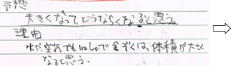 予想は実験の結果がどうなるのかを一文で書き,次の行に理由を書くようにする。「空気を冷やすとどうなるのかな」…(「ものの温度と体積」より)