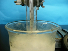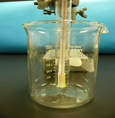 その中央に試験管を立てる。1~2秒おきに温度計を3~5回上下に動かす。
