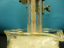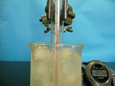 ○砕いて細かくした氷が最適(約150g)。製氷皿の大きさの氷だと大きすぎて試験管が立てにくい上に,300mlのビーカーでも12~13個で一杯になる。かき氷は温度は急に下がるが,空気を多く含むため水を加えた時,量が減る。さらに,かき氷を作る労力も大変である。
