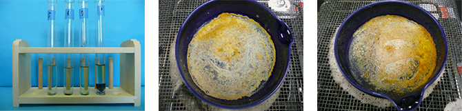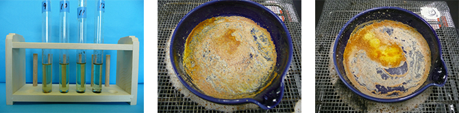 ◯ 蒸発皿の液体が沸騰し始めたら,極力弱火で加熱する。飛び散らないように,また,焦げないようにするために,余熱を活用する。塩化鉄は飛び散りやすいので,特に注意が必要である。