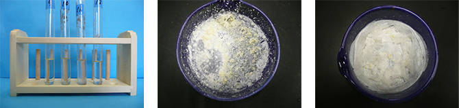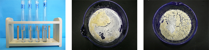 ◯ 反応が激しく試験管の上部に多少こびりつきはあるが,ほぼ全て溶けた。また,500mgを入れた試験管では反応が激しく吹きこぼれが生じた。